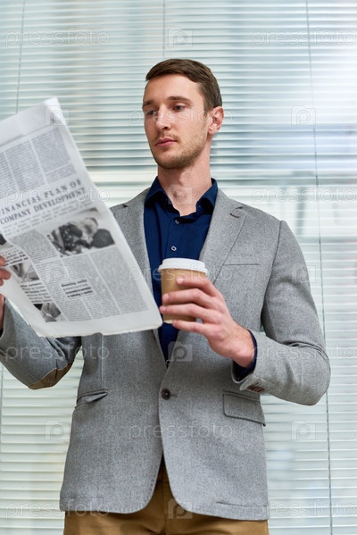 Красивый молодой человек читает газету в офисе