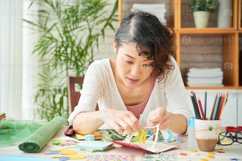 Японская женщина сосредоточена на скрапбуке