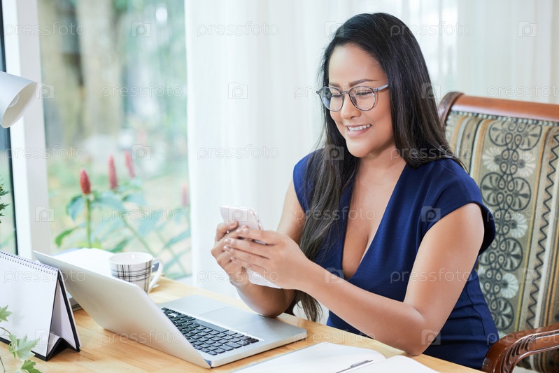 Улыбающаяся деловая женщина, использующая телефон на рабочем месте