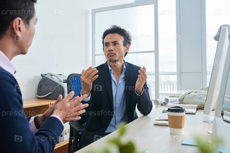 Бизнесмен обсуждает работу с коллегой