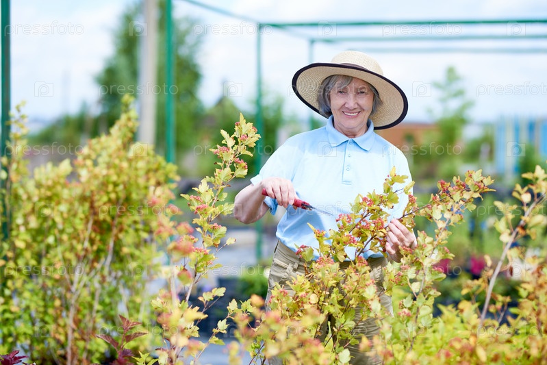 Улыбающаяся пожилая женщина работает в саду