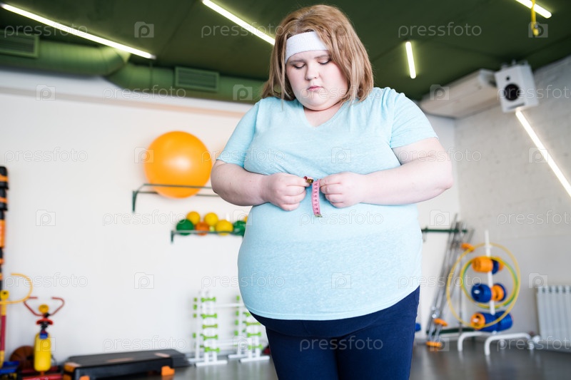 Печальная тучная женщина, измеряющая талию