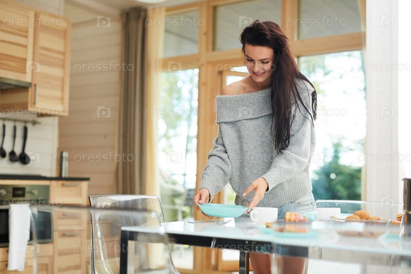Позитивная молодая мать устраивает стол в столовой