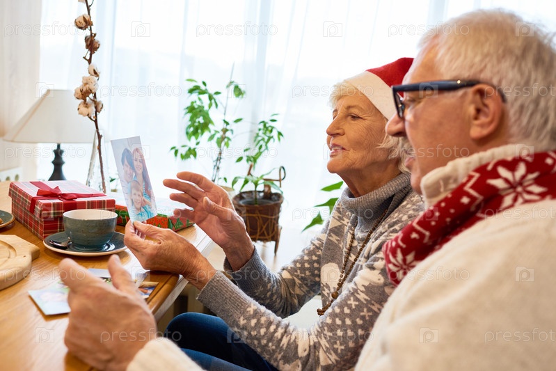 Старшая пара смотрит на фотографии в Рождество