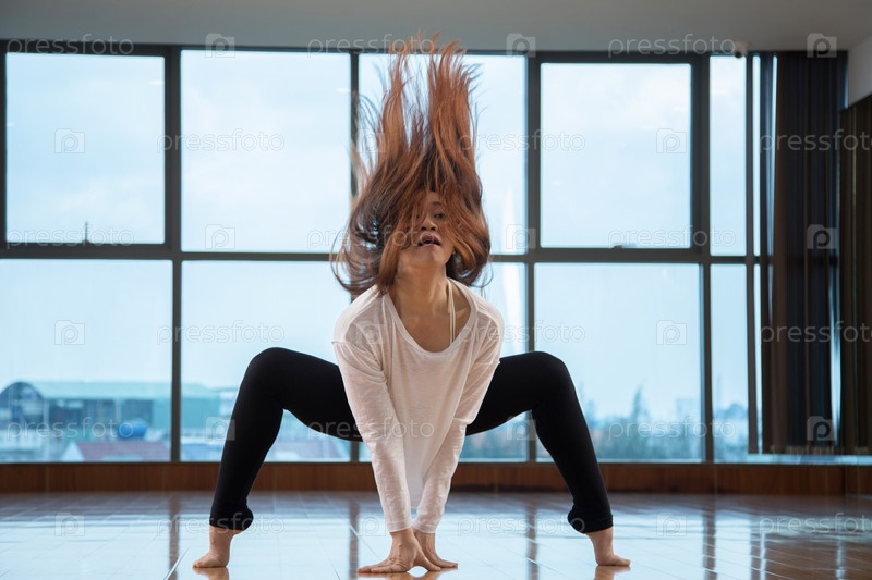 Азиатская женщина трясет волосами, танцуя