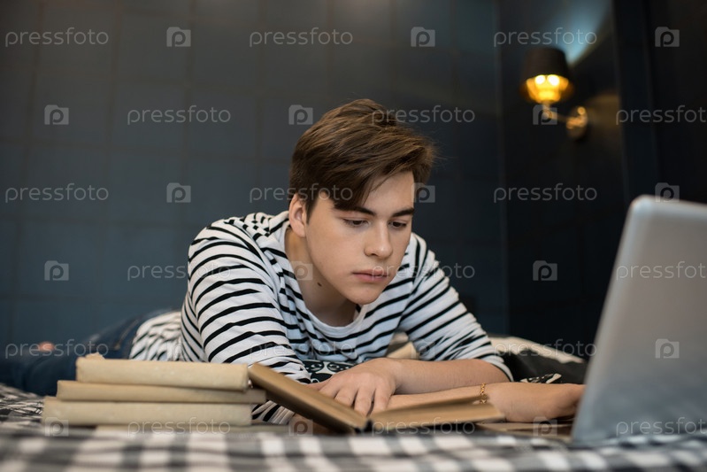 Молодой человек читает кучу книг, лежа на кровати