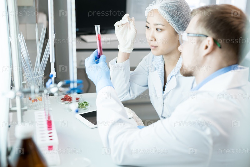 Микробиологи наблюдают за пробным стеклом с розовой жидкостью