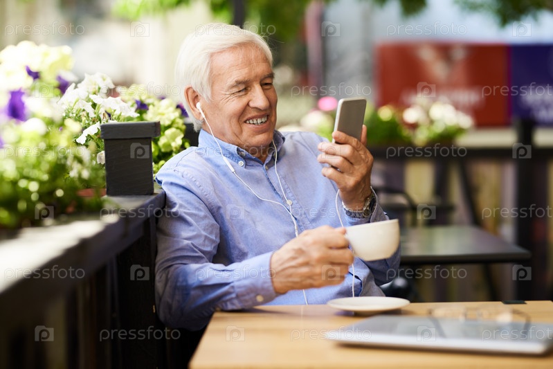 Мужчина, говорящий по видеозвонку в кафе Senior