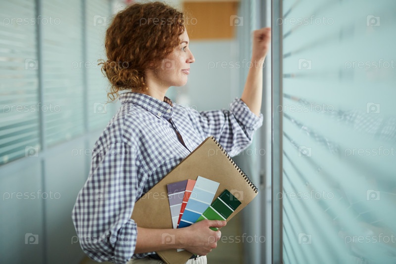 Улыбающийся студент дизайна заглядывает сквозь жалюзи