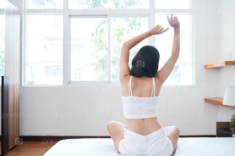 Женщина, растягивающаяся в постели