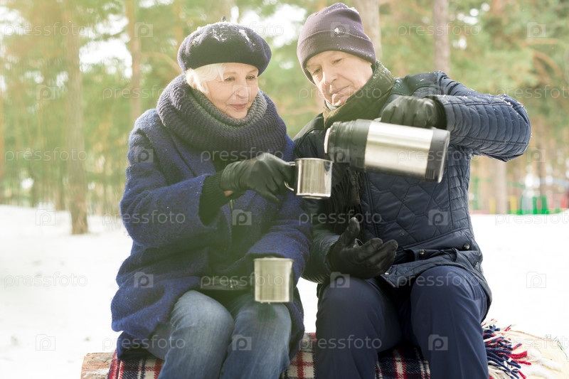 Старшая пара наслаждается горячими напитками