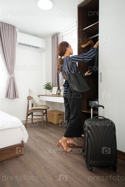 Леди вешает куртку в шкафу