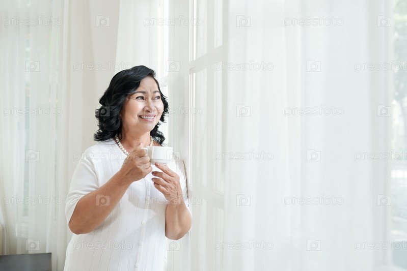 Зрелая женщина с кофе счастлива