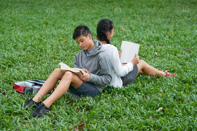 Дети читают на открытом воздухе