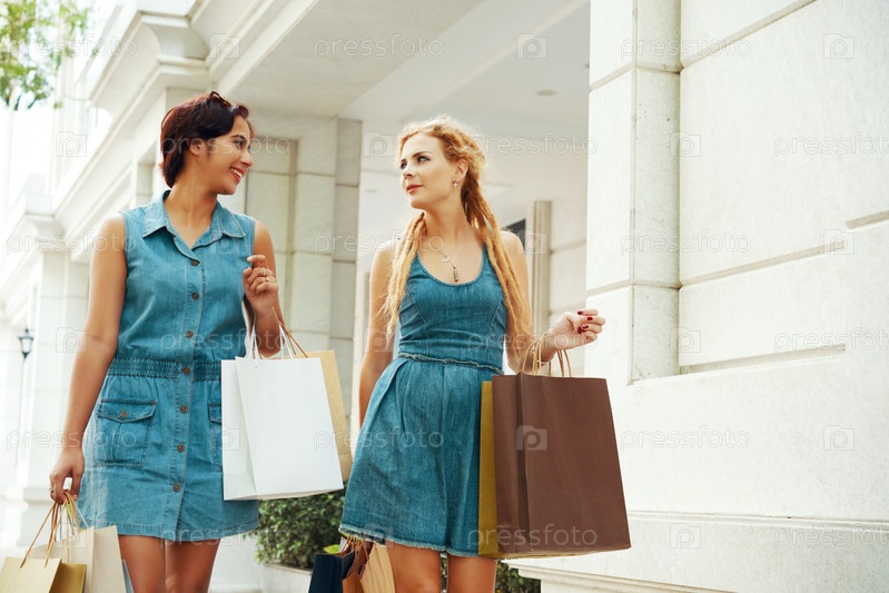 Общаться с подругами с бумажными пакетами на улице