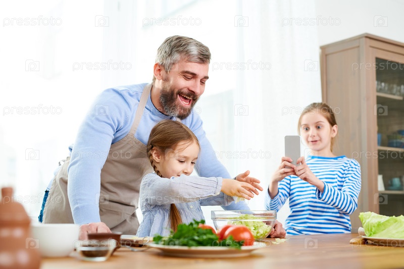 Семья блогеров по еде, готовящая салат
