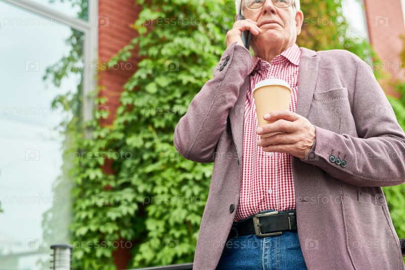 Современный старший мужчина, говорящий по телефону на открытом воздухе