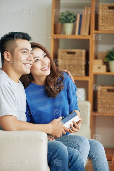 Любящая пара с настоящим сидит на диване