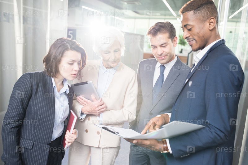 Любопытные коллеги по бизнесу просматривают данные, показанные аналитиком