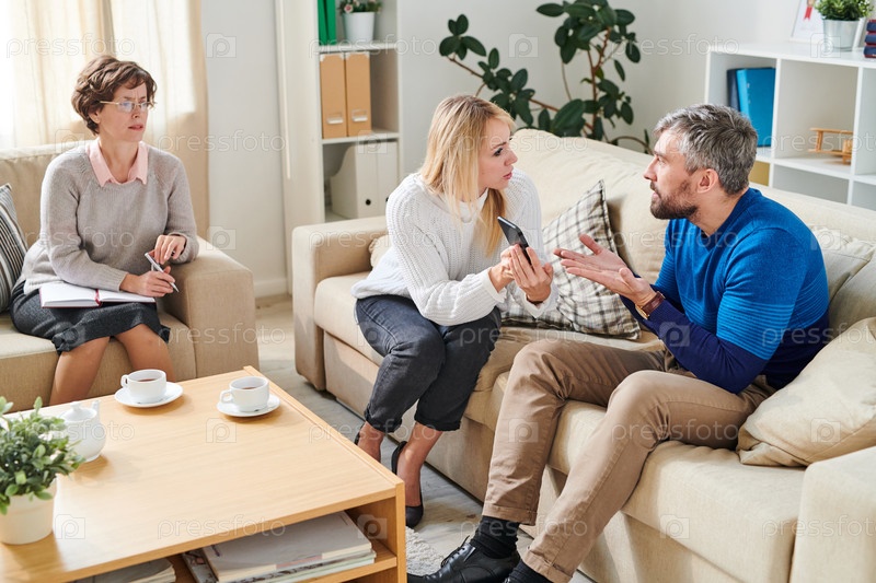 Разгневанная жена показывает СМС-сообщения от любовницы мужу в психологии се