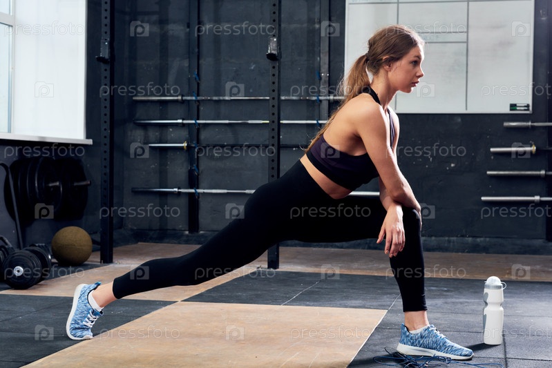 Красивая молодая женщина растягивается в тренажерном зале CrossFit