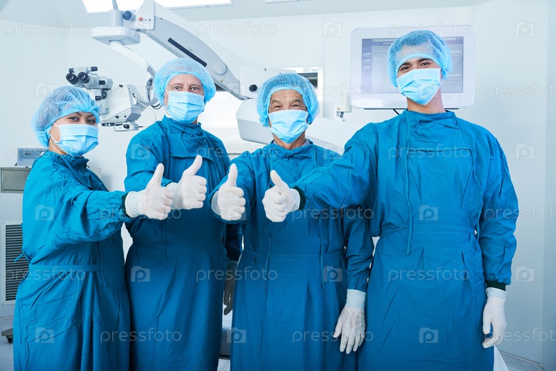 Азиатские хирурги жестикулируют пальцем вверх