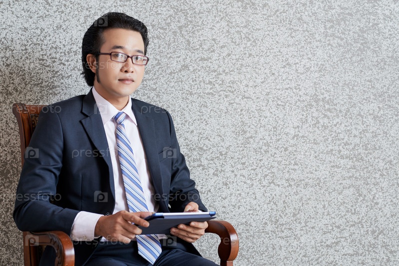 Серьезный бизнесмен с планшетом в кресле