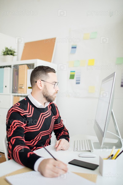 Концентрированный бизнесмен делает заметку, держа онлайн-анализ