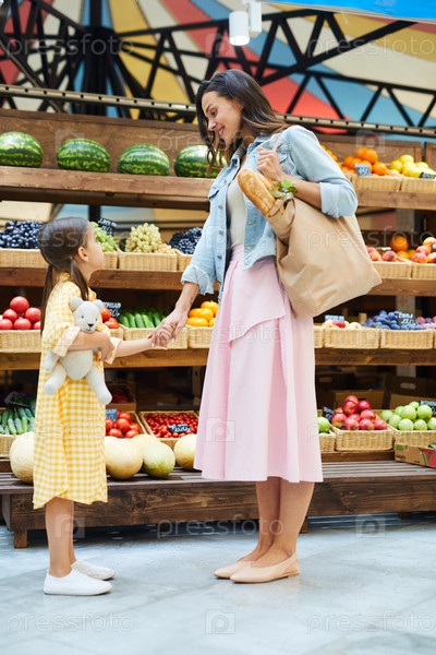 Красивая семья, беседующая на рынке свежей еды