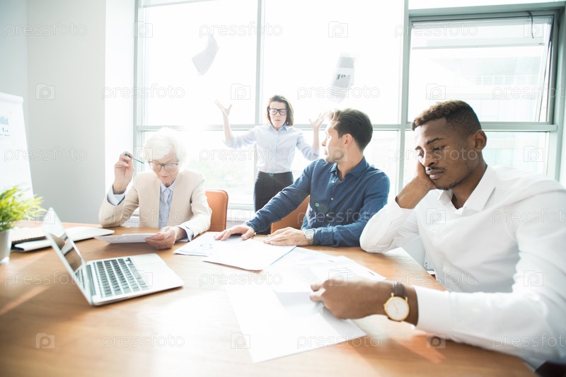 Раздраженная бизнесвуменка бросает бумаги на собрании персонала