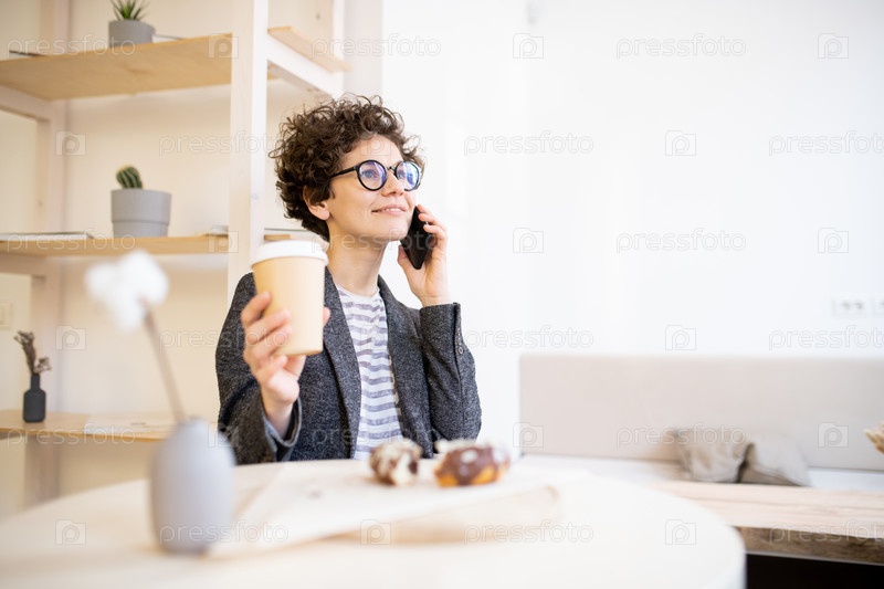 Задумчивая леди звонит по телефону в кафе