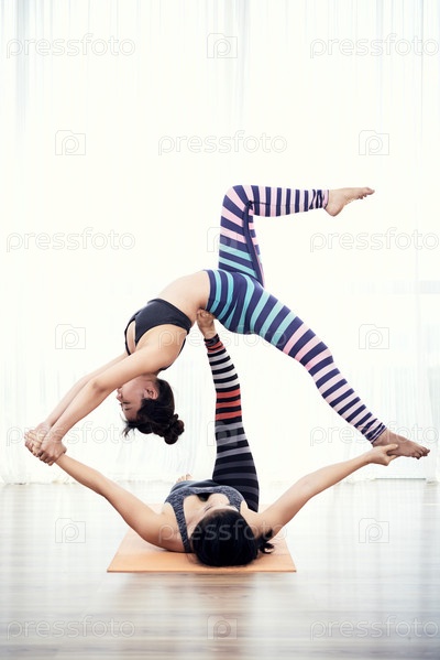 Женщина Акройоги поддерживает флаер в позе моста