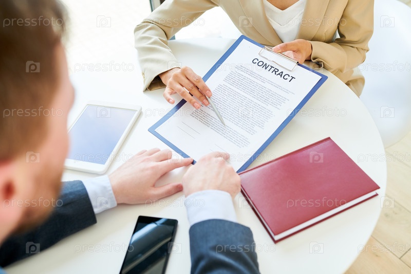 Деловая женщина показывает контракт клиенту в ближайшем подходе