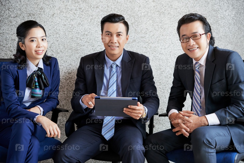 Уверенные в себе молодые бизнесмены, сидящие с планшетом