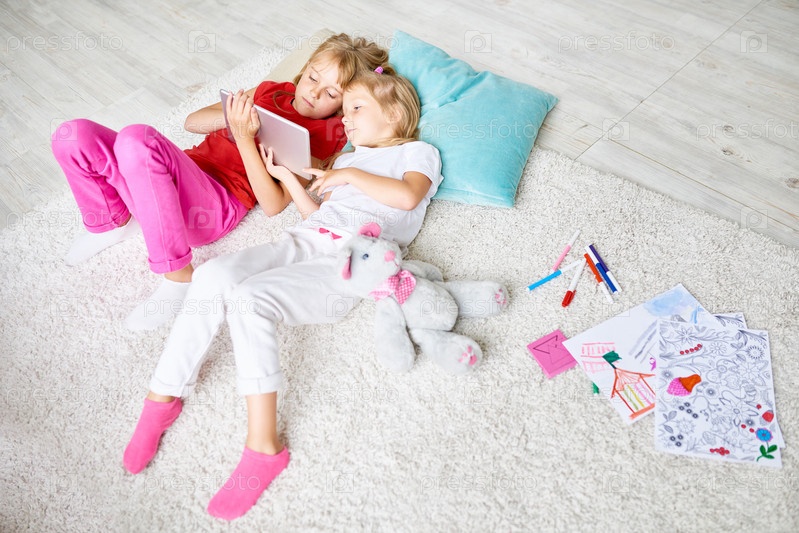 Маленькие девочки, использующие планшеты дома