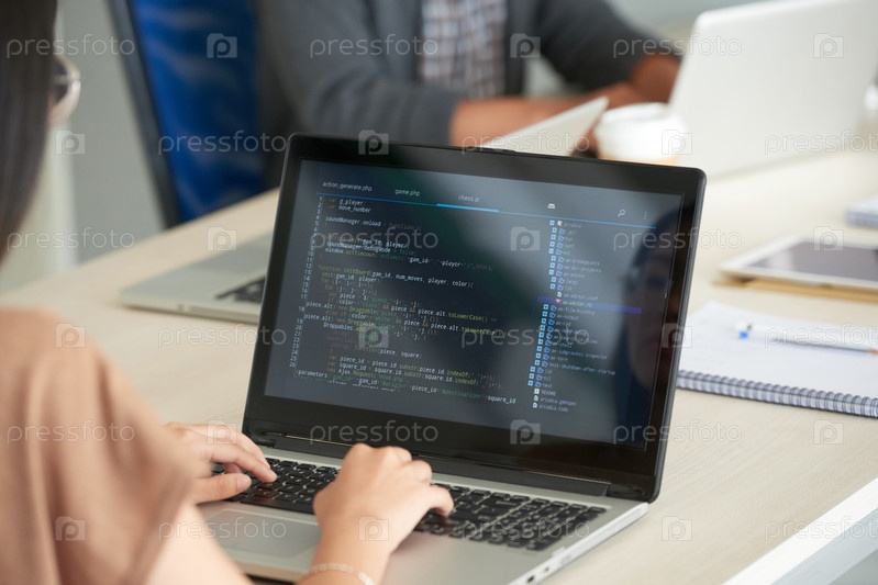 Женщина программирует на ноутбуке в офисе