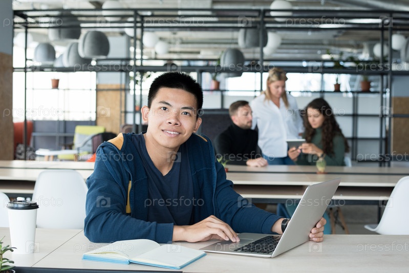 Молодой человек позирует в офисе азиатский