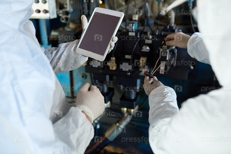 Работники в защитных костюмах используют цифровые планшеты
