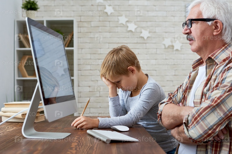 Старший мужчина делает домашнее задание с внуком