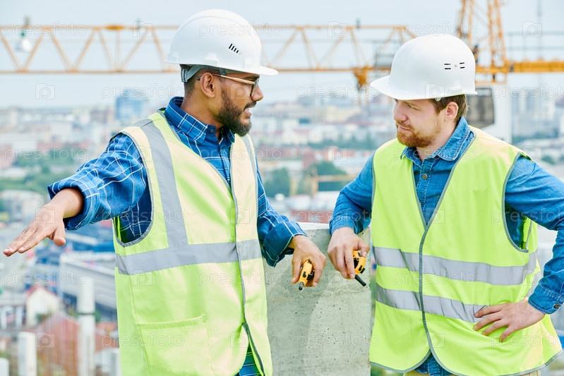 Инженер-строитель смешанной расы разговаривает со своим коллегой