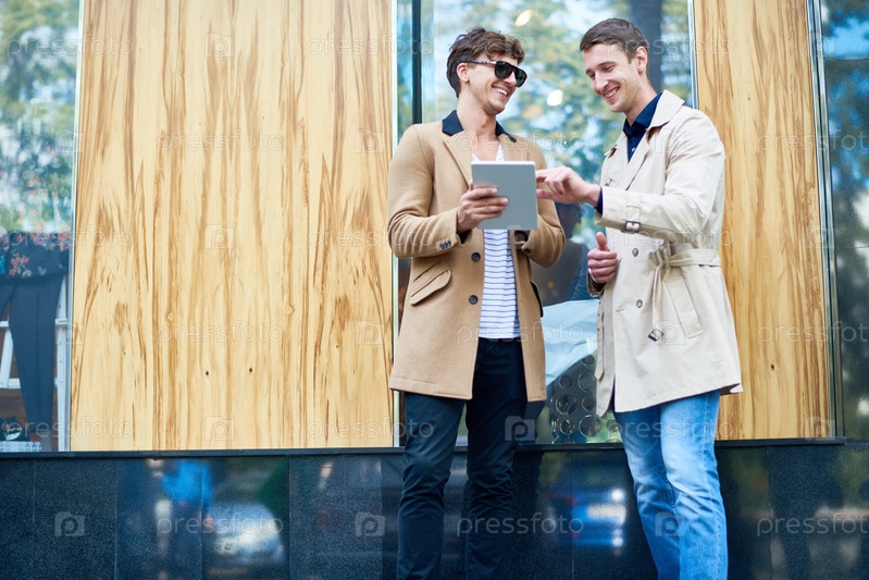Два улыбающихся бизнесмена используют планшет на улице