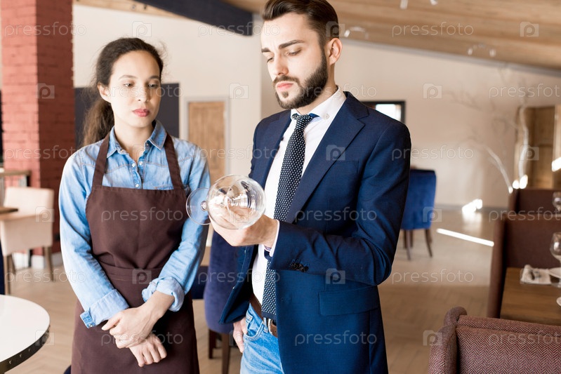 Нахмурившийся ресторатор проверяет виноградное стекло