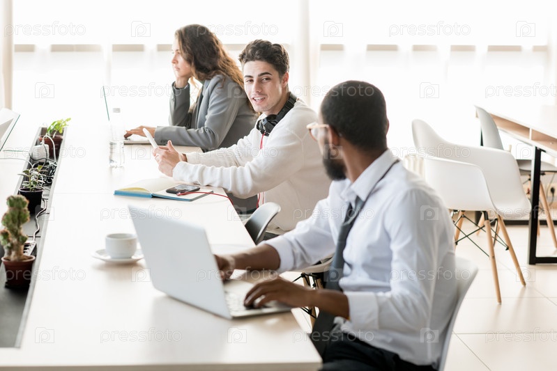 Молодые люди работают и отдыхают в коворкинг-пространстве