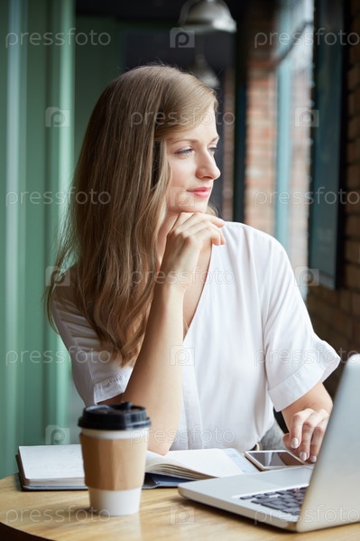 Задумчивая женщина-блогер