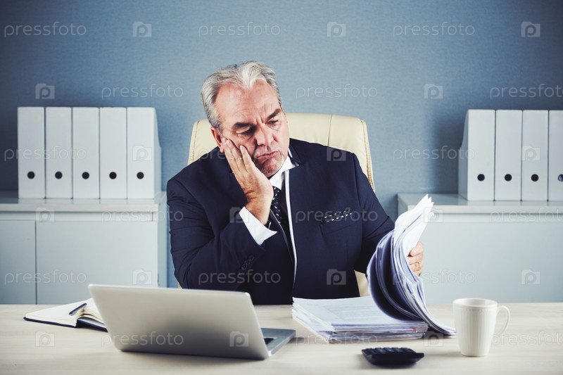 Утомленный бизнесмен смотрит на кучу документов