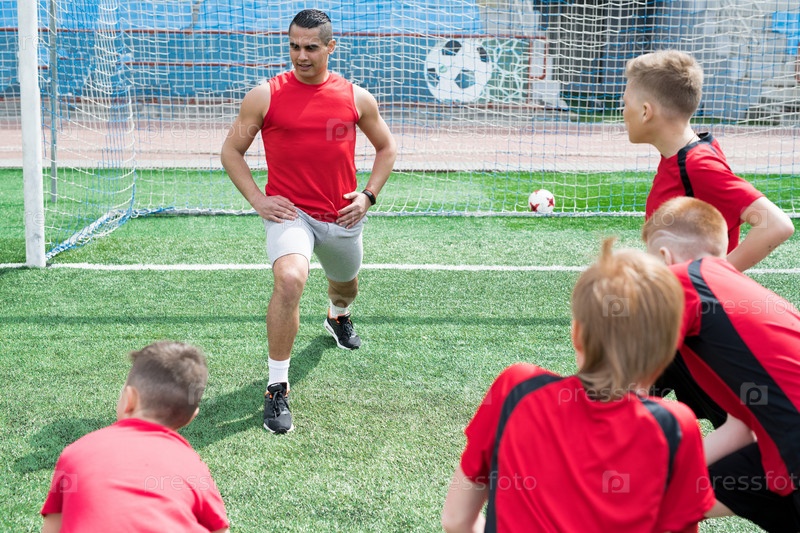 Футбольный тренер показывает упражнения