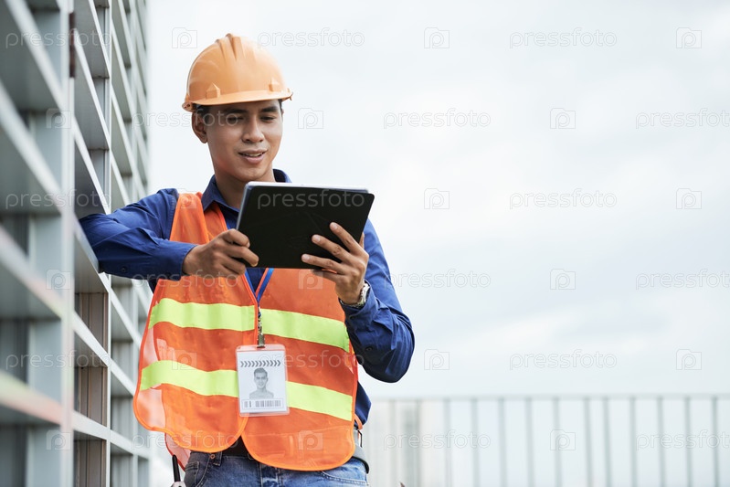 Азиатский инженер использует планшет рядом со стеной