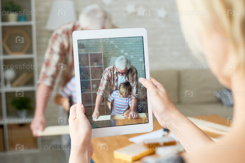 Дедушка и внук на экране цифрового планшета