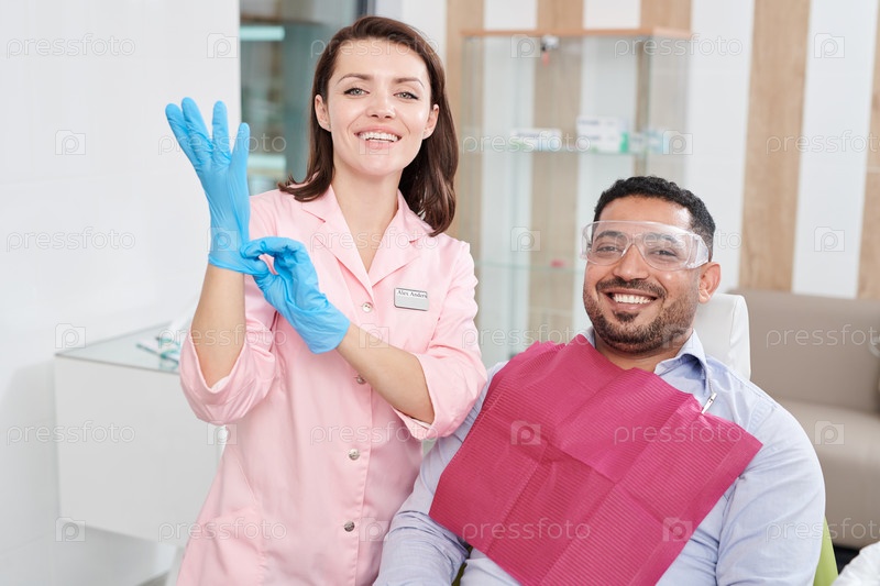Улыбающаяся стоматолог-женщина позирует с пациентом