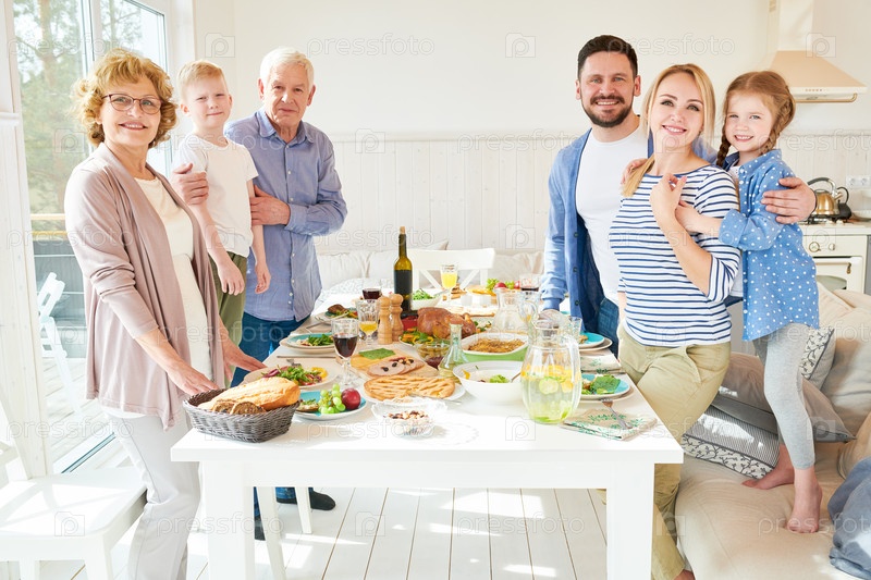 Большая семья позирует за обеденным столом